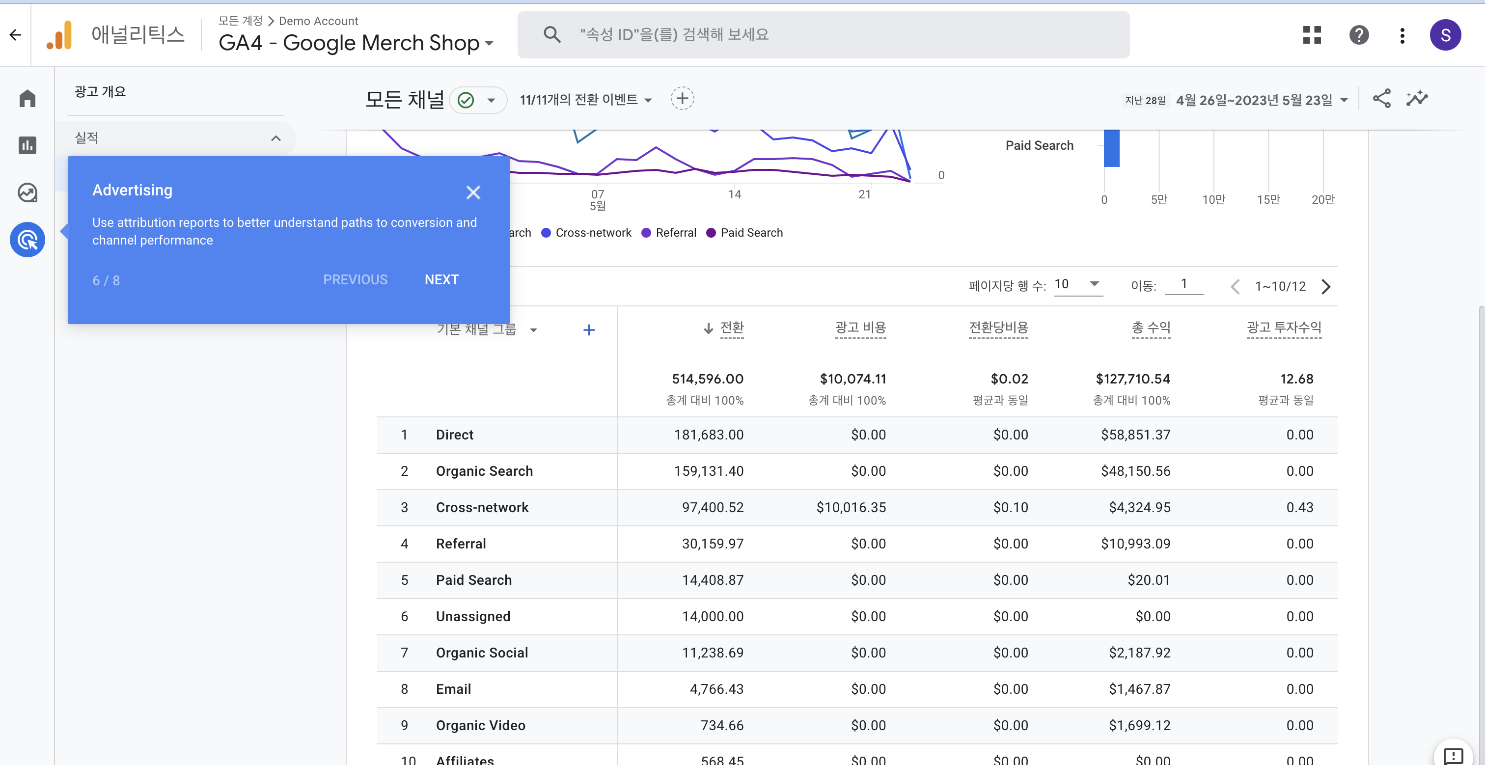광고 탭에서는 관심을 가질 수 밖에 없는 전환(conversion), 채널별 퍼포먼스에 대한 분석이 가능하다.