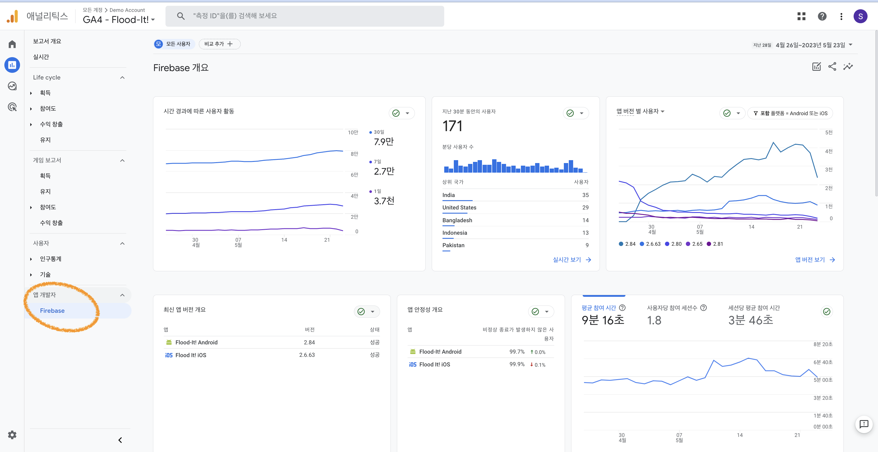 Firebase도 잘 연동되어 있음을 확인할 수 있다. "게임 보고서"항목이 추가되어 있고, 다양한 분석을 수행해볼 수 있다.