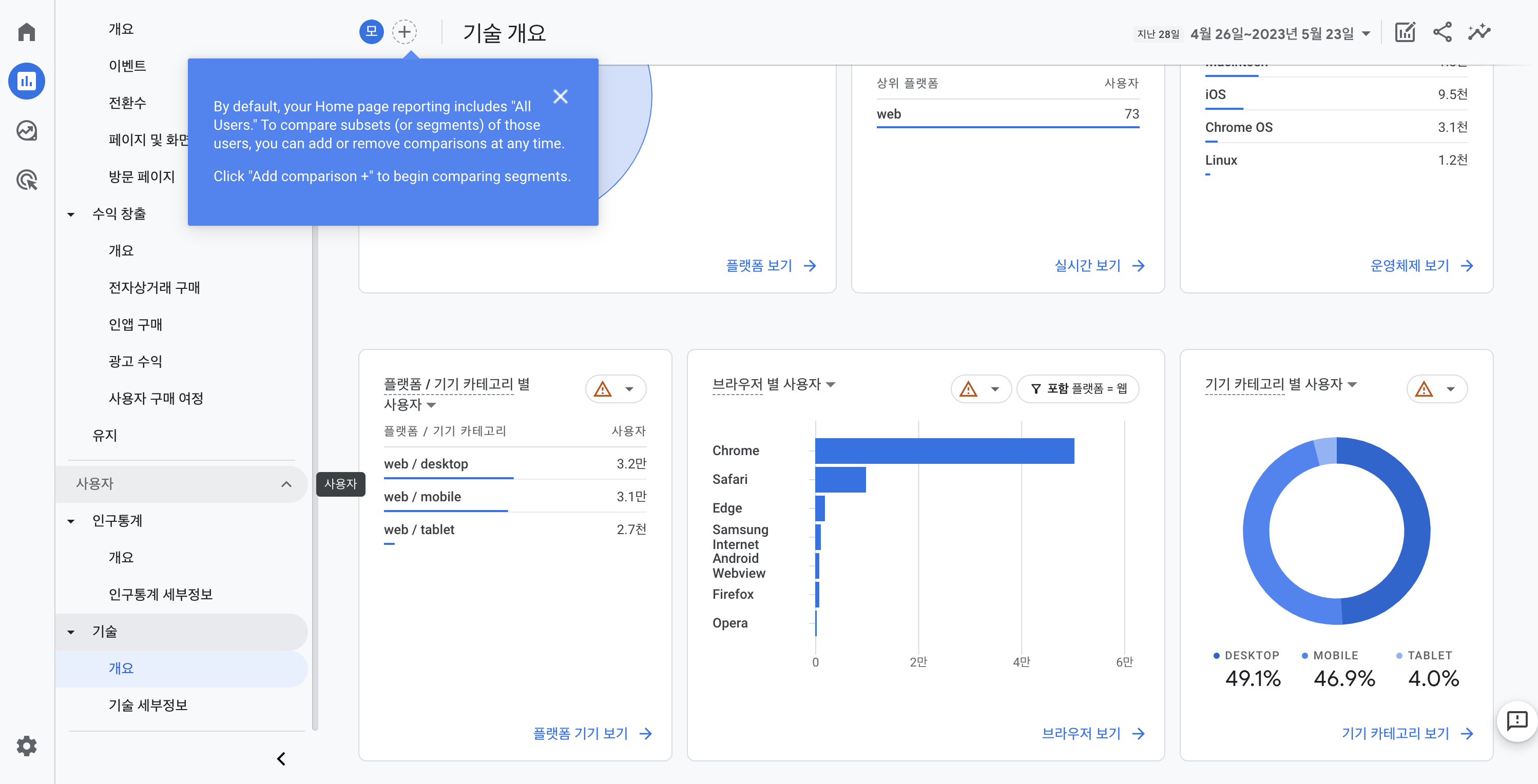 계속해서 GA4 보고서를 둘러보면서 확인해본다. 기기나 플랫폼별 유입은 가장 하단의 '기술'에서 볼 수 있는데,