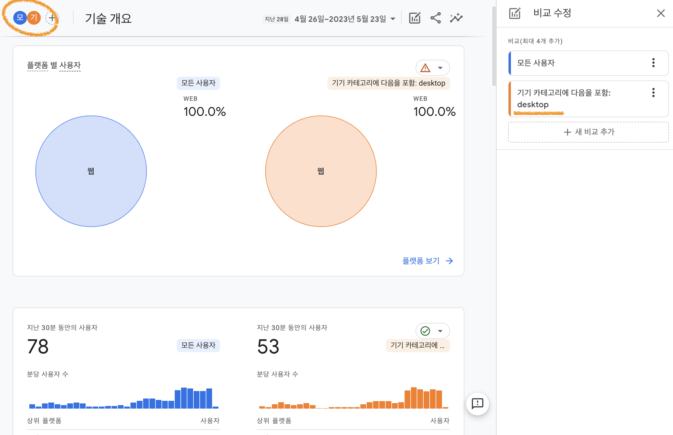 이렇게 모든 사용자 기준 데이터 vs desktop 사용자 기준 데이터를 비교해볼 수 있다.