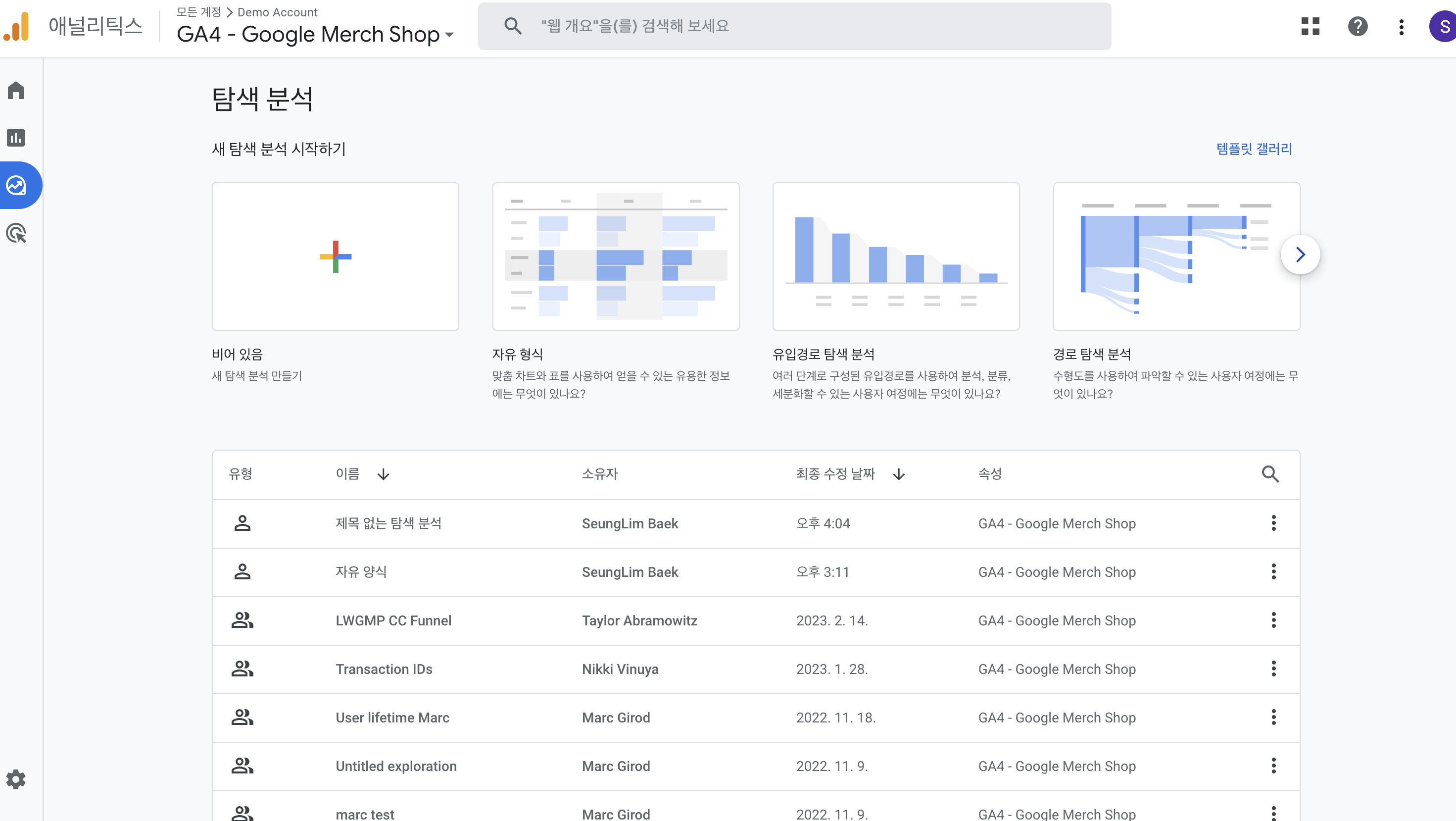 내가 예전에 만들었거나, 다른 사용자가 나와 공유한 탐색도 볼 수 있다. (기본적으로는 비공개라 작성자만 보고 편집 가능)