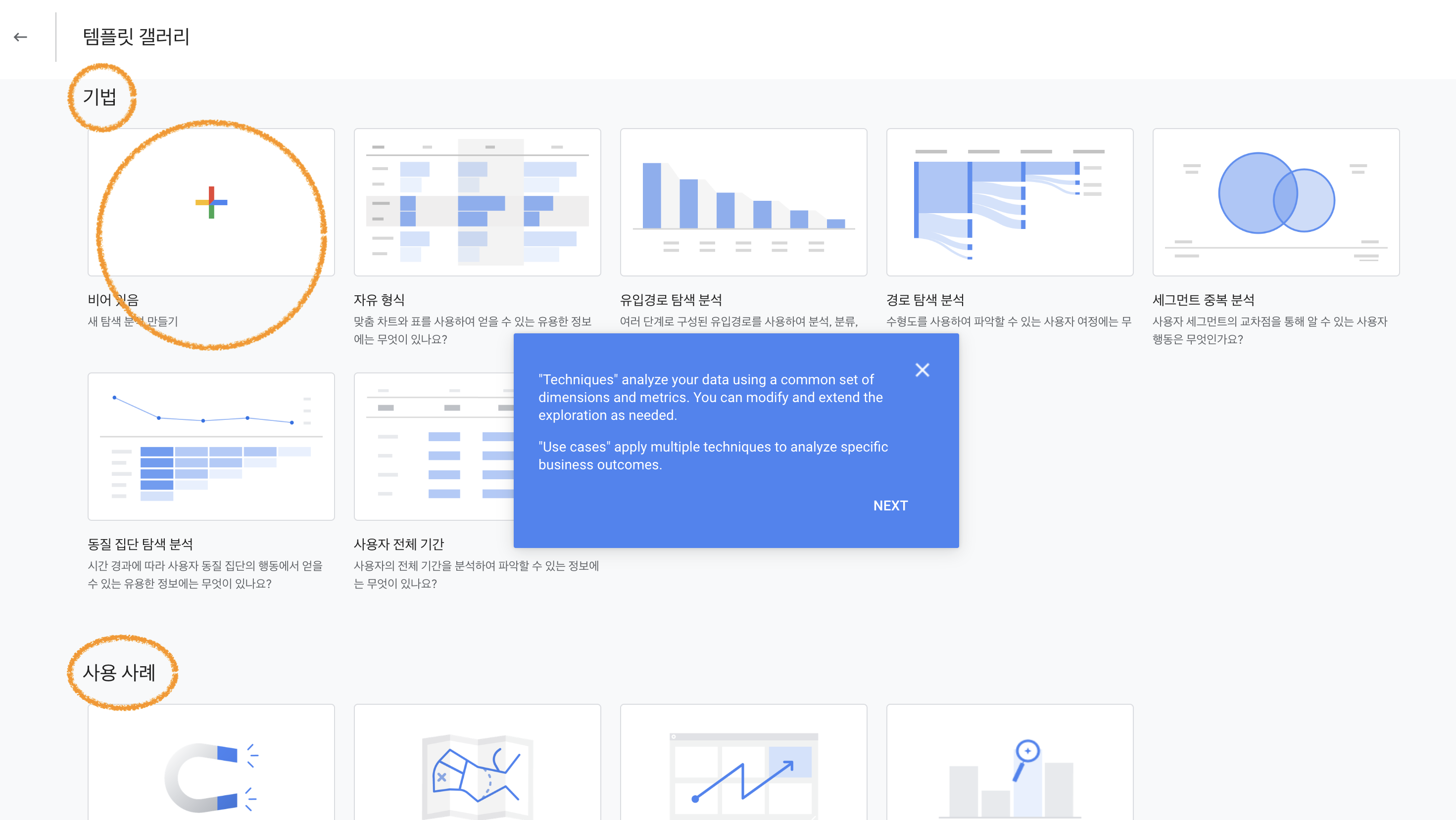 아래와 같이 기본 랜딩 페이지를 Explorations snapshot이라고 한다. 이 페이지에서 처음부터 새 탐색을 만들거나, 템플릿 갤러리에서 하나를 선택할 수 있다.
