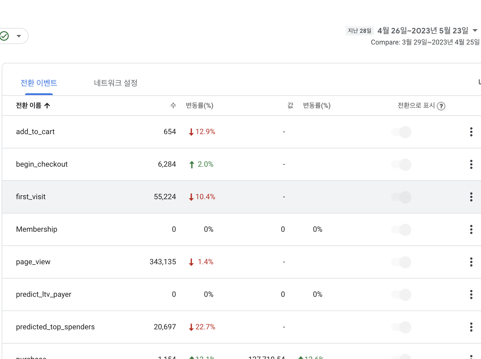 이벤트처럼, 현재 존재하는 전환 이벤트와 각각 실적에 대한 스냅샷을 볼 수 있다.