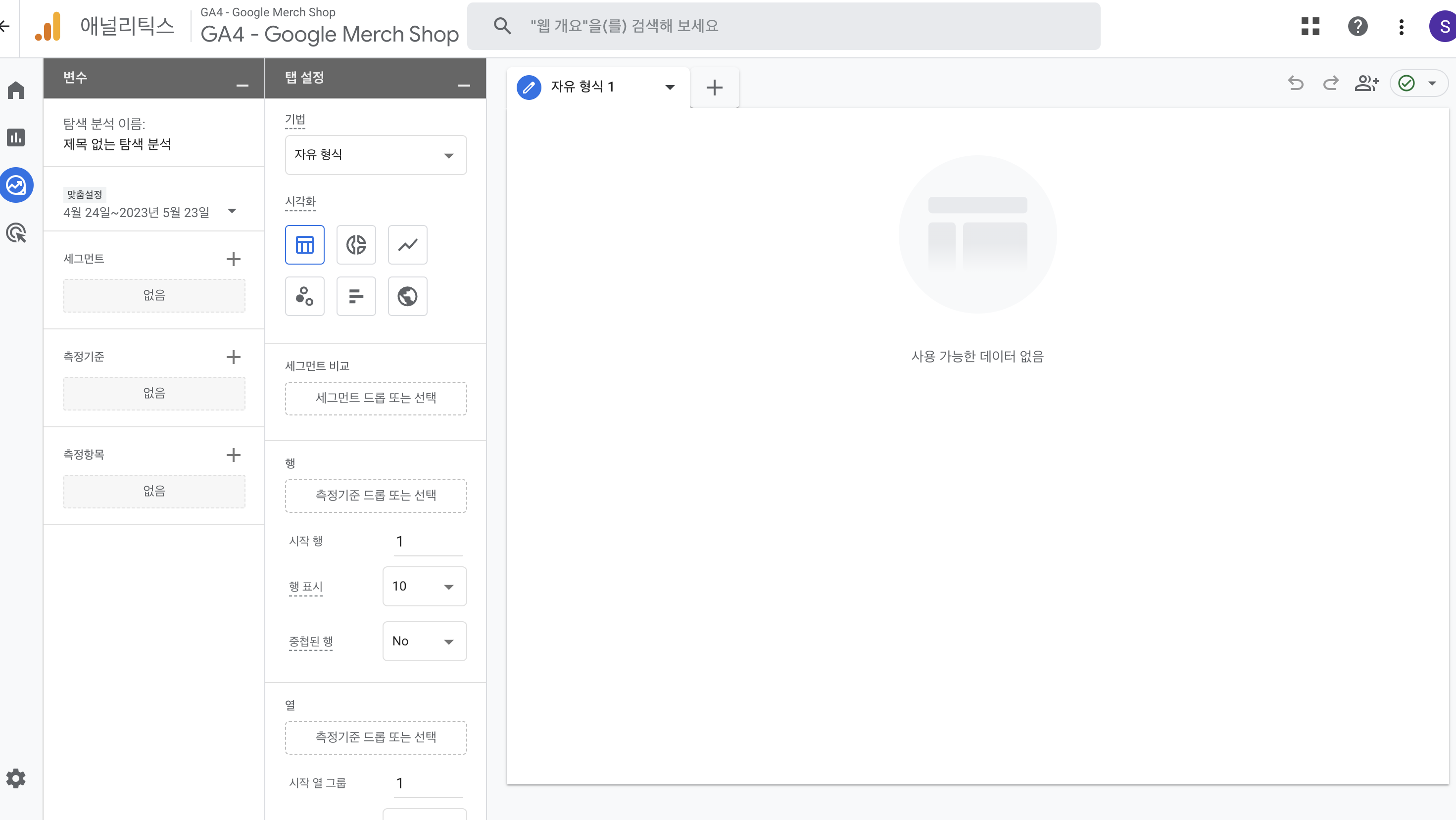 시각화 도구를 활용해서 그래드앤 드롭으로 세그먼트 비교, 행과 열 설정까지 모두 가능하다.
