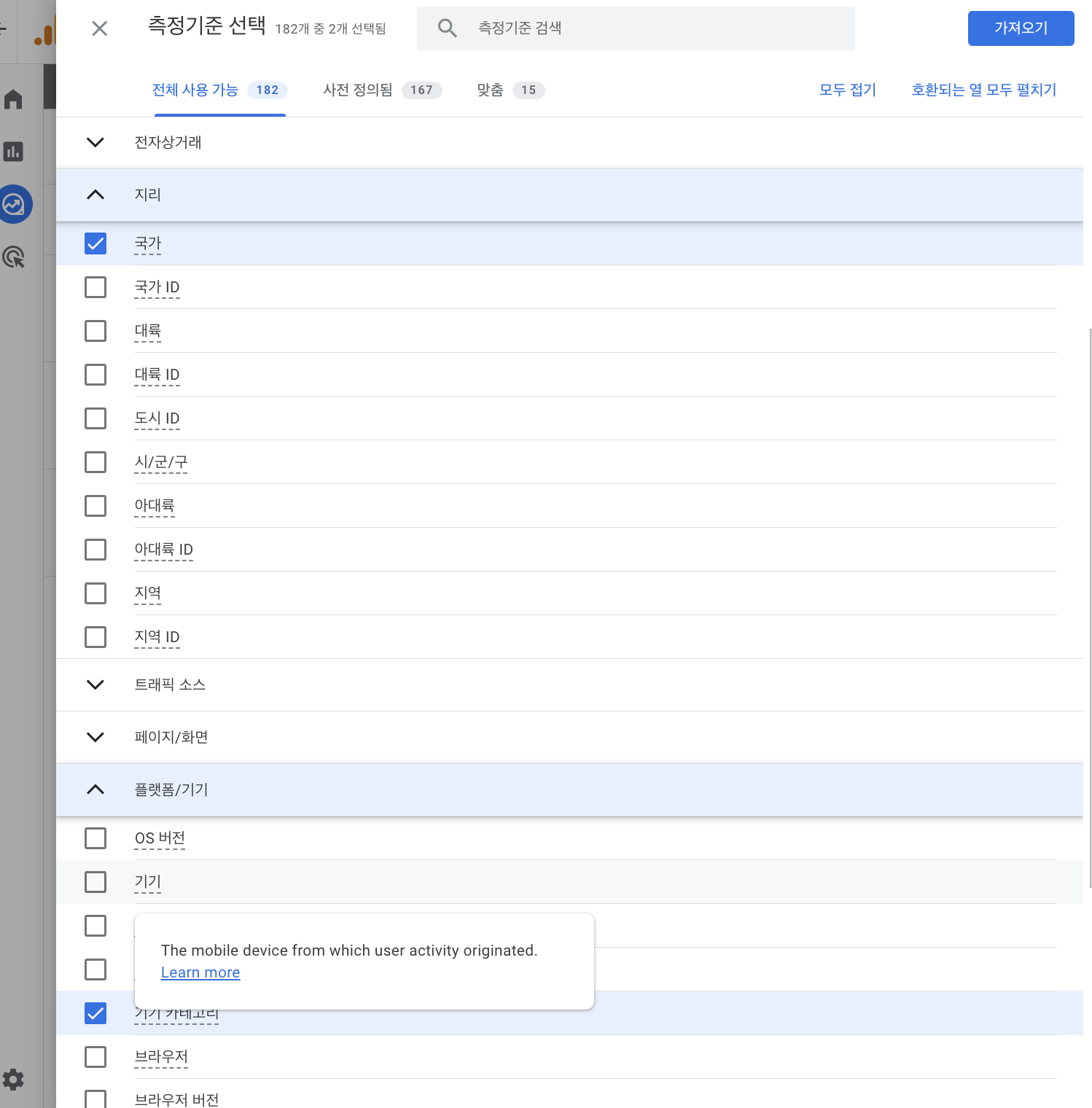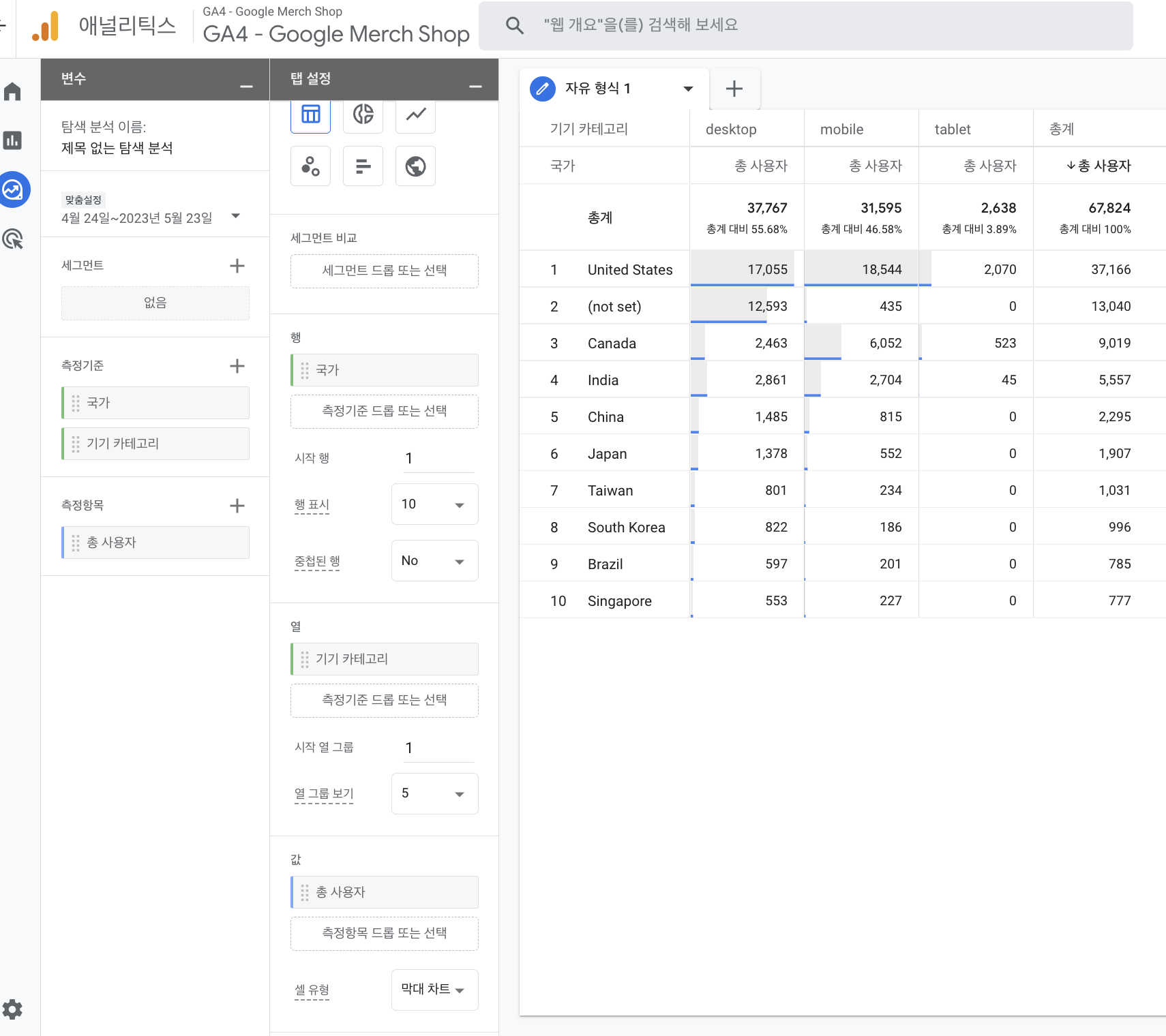 측정기준에 '국가'와 '기기 카테고리'를 설정해서 각각 행과 열로 넣고,