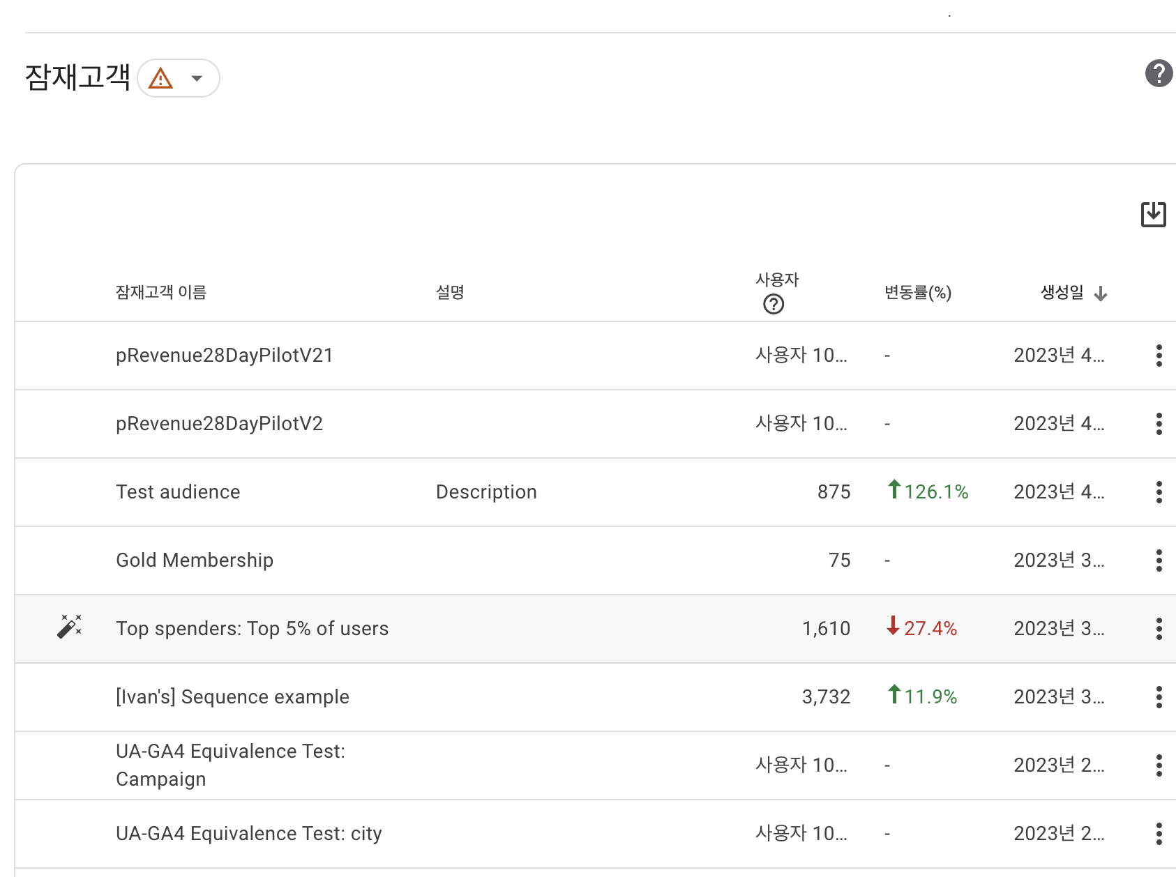 이 용어도 그대로 Audience라고 많이 쓰는데, 현재 존재하는 잠재고객과 각 잠재고객에 대한 정보(사용자 수, 생성 날짜 등)를 여기서 볼 수 있다.