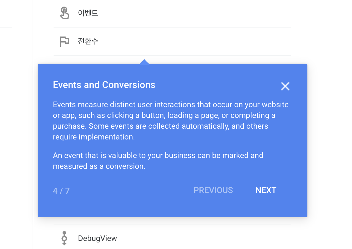 전환수(Events and conversions)에서는 웹, 앱에서 일어나는 이벤트나 전환을 확인할 수 있다.