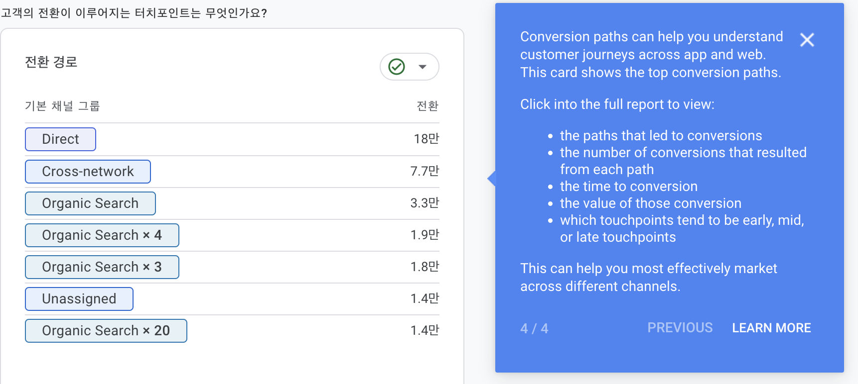 전환 경로 보고서를 보면서 고객의 전환 경로와, 다양한 기여모델이 해당 경로에서 기여도를 분배하는 방식을 확인할 수 있다.