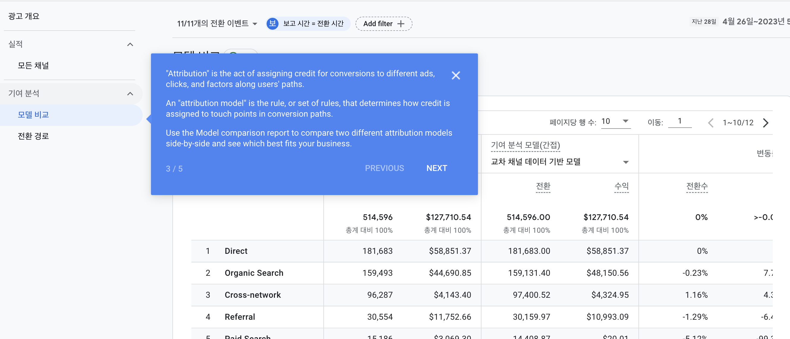 모델 비교 보고서에서는 다양한 기여 모델이 마케팅 채널, 소스, 매체, 캠페인 전반에서 기여도를 부여하는 방식을 비교해볼 수 있다.