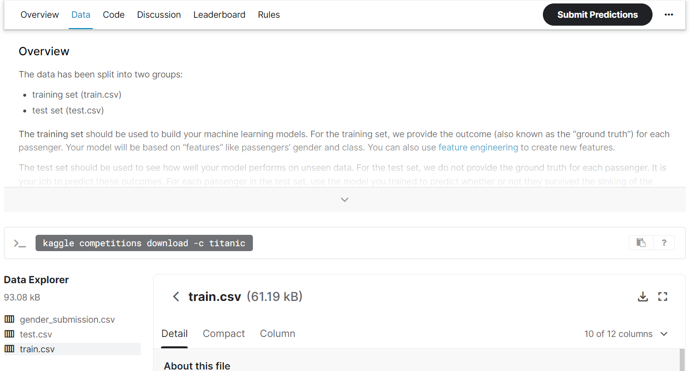 데이터 탭을 클릭해서 아래로 내려보면 train.csv 데이터셋이 있다. 이 파일을 원하는 경로에 옮겨 저장해 주자.