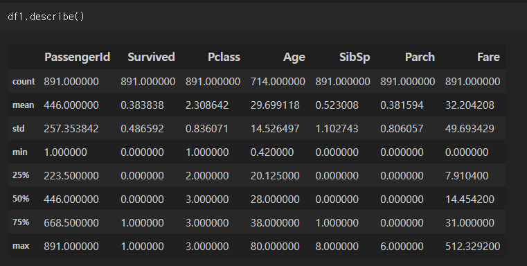 유의할 점은 info에서 확인했던 Name, Age와 같은 object 타입(문자열 타입)은 제외된다는 점, count는 Null값이 아닌 데이터의 건수를 나타낸다는 점이다.