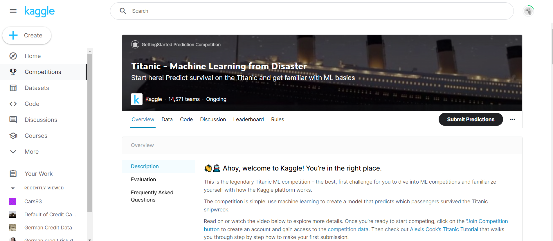캐글의 시작이라고 할 수 있는 타이타닉 데이터를 다운로드하여보자. kaggle 사이트에 접속해서 회원가입을 해야 데이터셋을 다운로드할 수 있다. 대부분 경연의 예제라서 참가 규정과 관련하여 I understand and accept 버튼을 클릭해야 받을 수 있다.