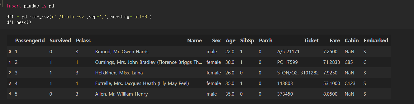 맨 왼쪽 부분이 바로 인덱스! (PassengerId처럼 만일 파일 내에 따로 다른 인덱스가 있다면 csv 내보내기를 할 때 없앨 수도 있는데, 데이터베이스 관점으로 볼 때 꼭! 각 데이터의 고유한 값을 Key로 사용해주어야 한다.)