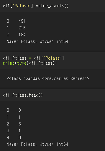 Pclass 칼럼을 Series 형태로 반환한 다음, value_counts()로 유형과 건수를 확인할 수 있는데, value_counts()는 굉장히 많이 쓰이지만 시리즈 객체에서만 정의되어 있다는 점을 기억하자.