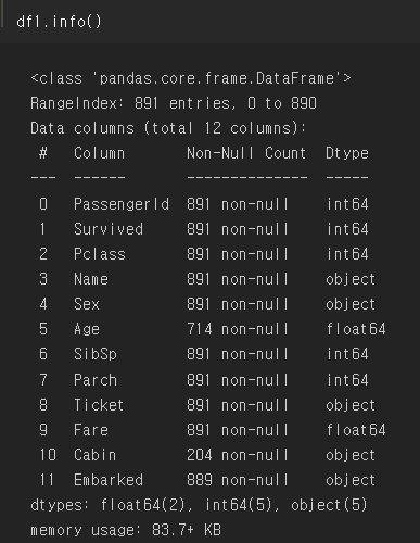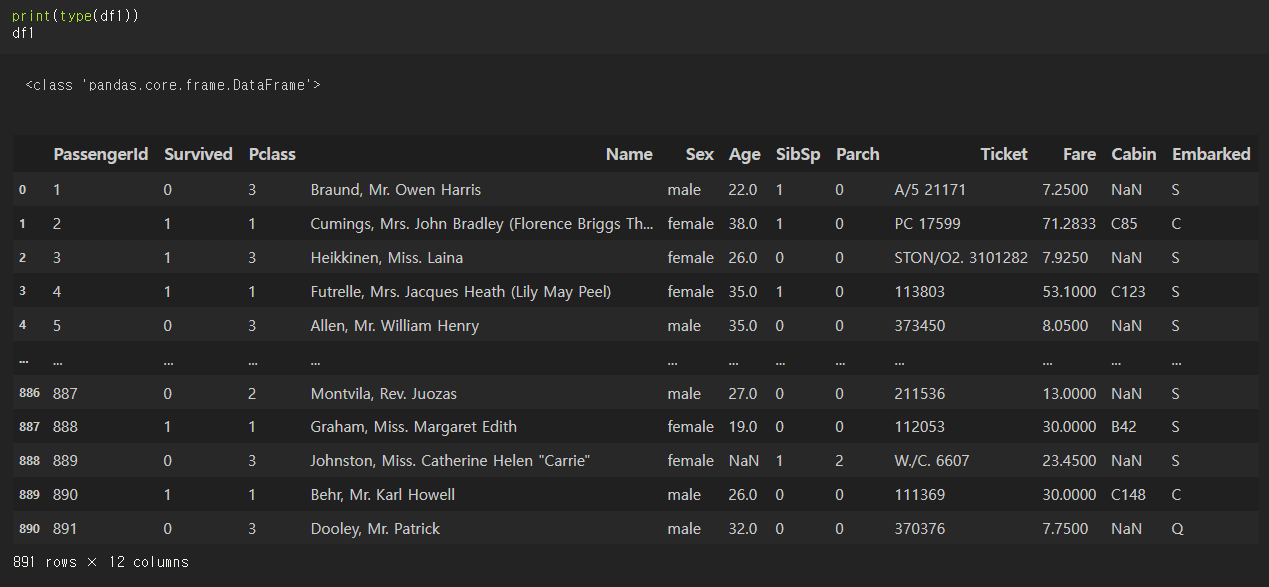891 rows와 12 colums로 구성되어 있는데, 데이터프레임명.shape() 변수를 써서 행, 열 튜플 형태로 반환도 가능하다.