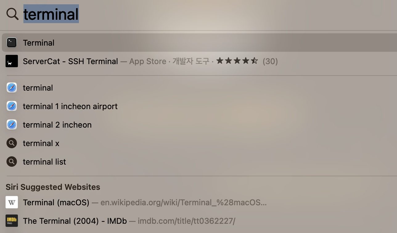 터미널은 command+스페이스바를 누른 후 terminal을 입력해서 열 수 있다.