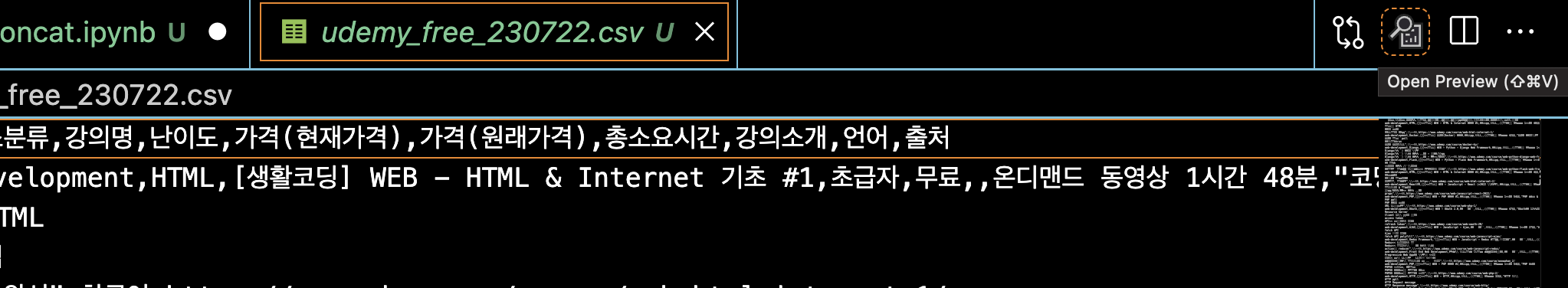 그러면 이렇게 안 예쁘게 보이는 csv 파일을 열었을 때 우측 상단에 돋보기 모양 아이콘이 뜨는데, 클릭!